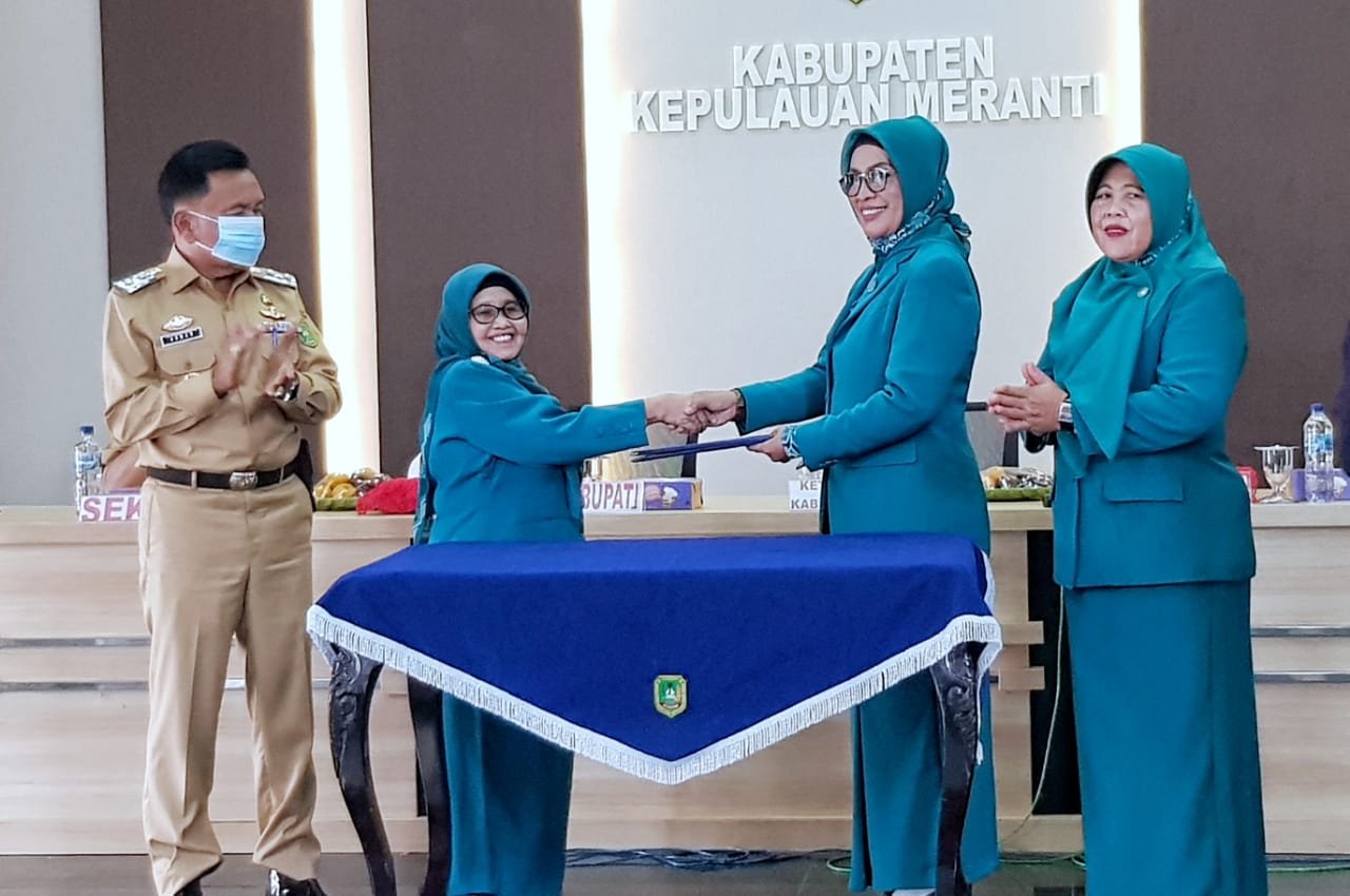 Serah terima Jabatan Ketua Tim Penggerak PKK Meranti, ditandai dengan penandatanganan berita acara dan penyerahan memory pertanggungjawaban, oleh Ketua PKK Meranti sebelumnya yang diwakili oleh Wakil Ketua Rosdiani dan Ketua PKK Hj. Rinarni M. Adil.
