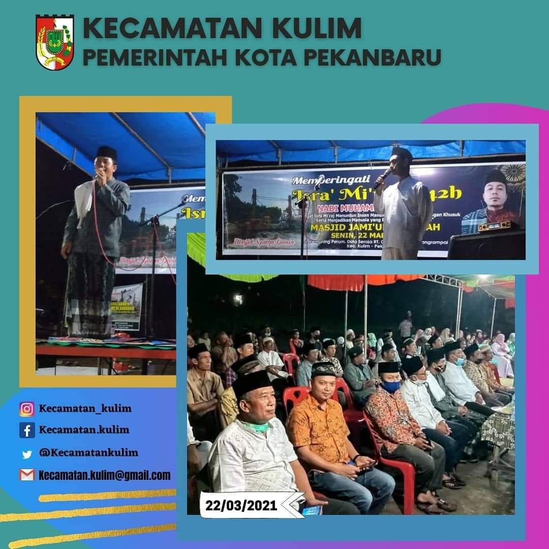 Begitu juga sama dengan Camat Kulim yang diwakili Sekcam Mukhtaruddin.S.Sos saat memberikan sambutan mengatakan bahwa Isra’ Mi’raj adalah Perjalanan Nabi Muhammad SAW bertemu Allah ke Sidratul Muntaha atau langit ke tujuh dalam satu malam saja dimana beliau menerima perintah sholat wajib lima waktu setiap hari.