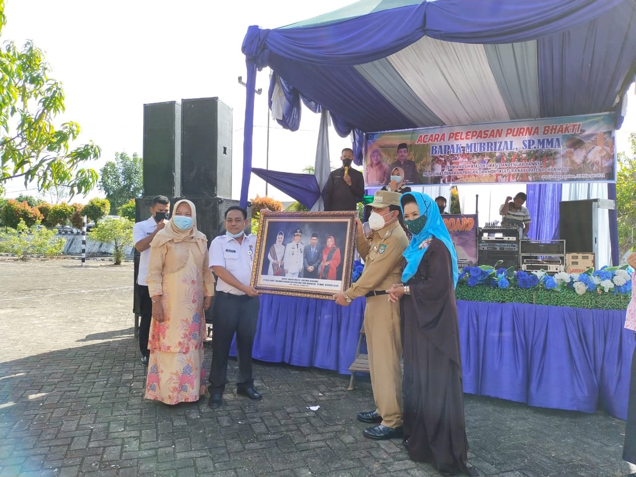Rohul(SegmenNews.com)- Bupati kabupaten Rokan hulu H. Sukiman lepas purna bakti kepala dinas (Kadis) tanaman pangan dan holtikultura (Tanhor) Mubrizal, SP. MMA yang tetap mengikuti protokol kesehatan ditengah pandemi covid-19 yang bertempat di halaman kantor Tanhor, Rabu (31/3/2021) siang.