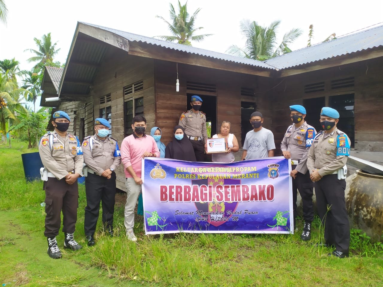 Meranti(SegmenNews.com)- Personel Propam Polres Kepulauan Meranti membagikan sembako gratis untuk warga kurang mampu sekitar Mako Polres di Desa Gogok Darussalam, Jum’at (23/4/2021).
