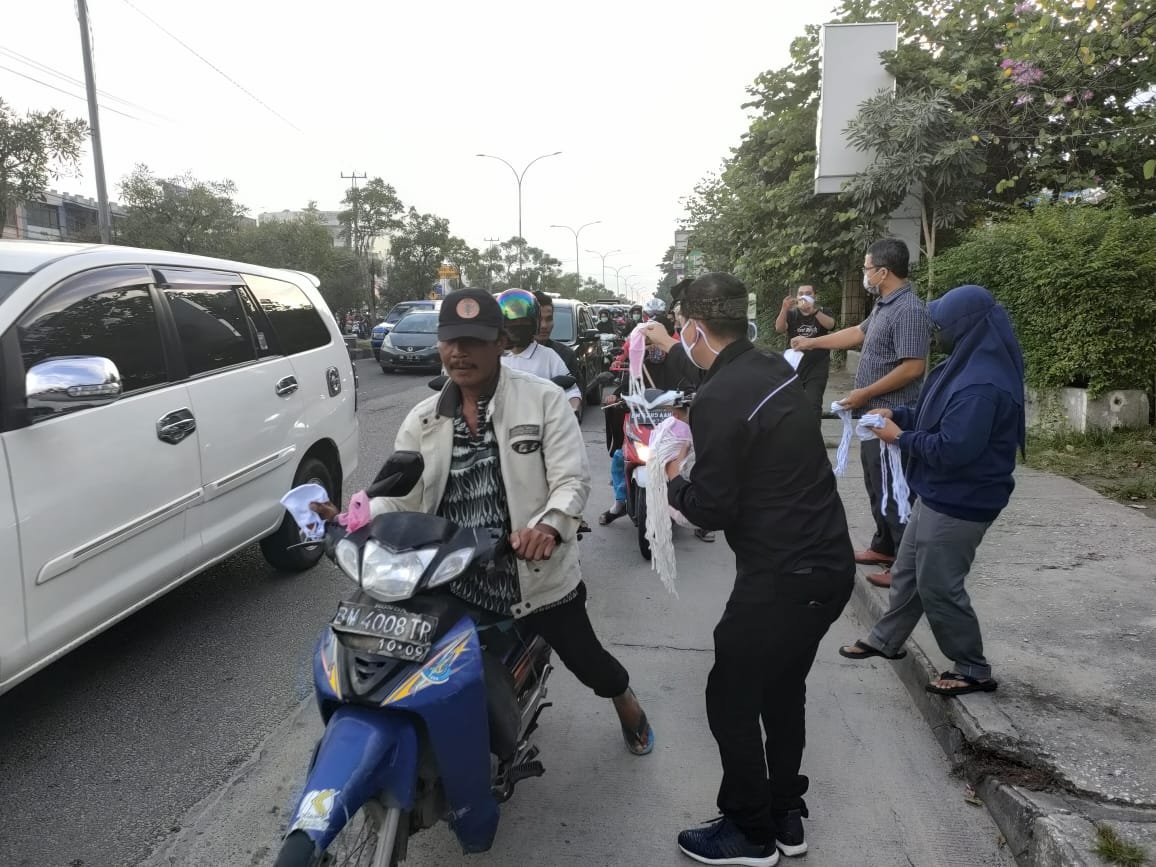 Meski ditengah trik matahari Pengurus FPR , BPBD Kota Pekanbaru serta adik-adik Mahasiswa dengan semangat membagikan Masker kepada warga pengguna jalan.