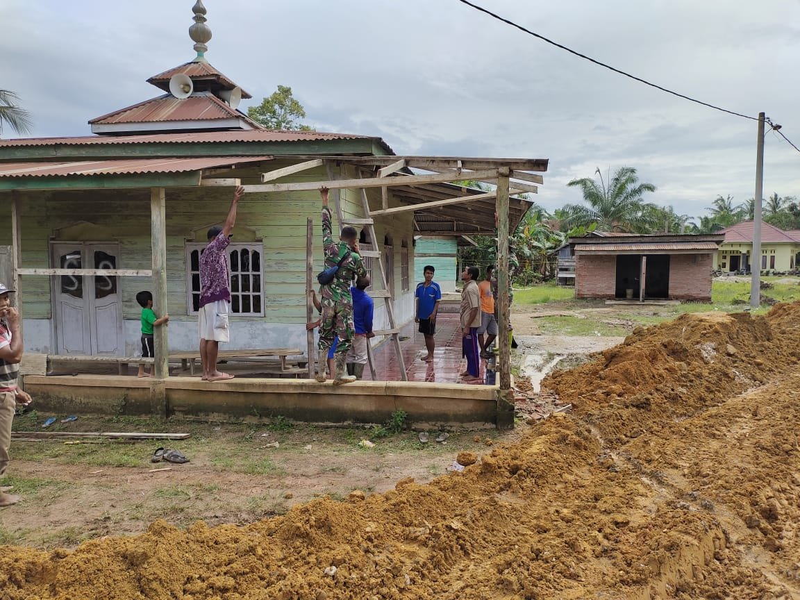 Seperti yang dilaksanakan hari ini, Selasa (13/7/2021). Tampak beberapa anggota satgas TMMD ke 111 Kodim 0321/Rohil membantu warga untuk membangun teras mesjid Al-Hidayahtul Manar.