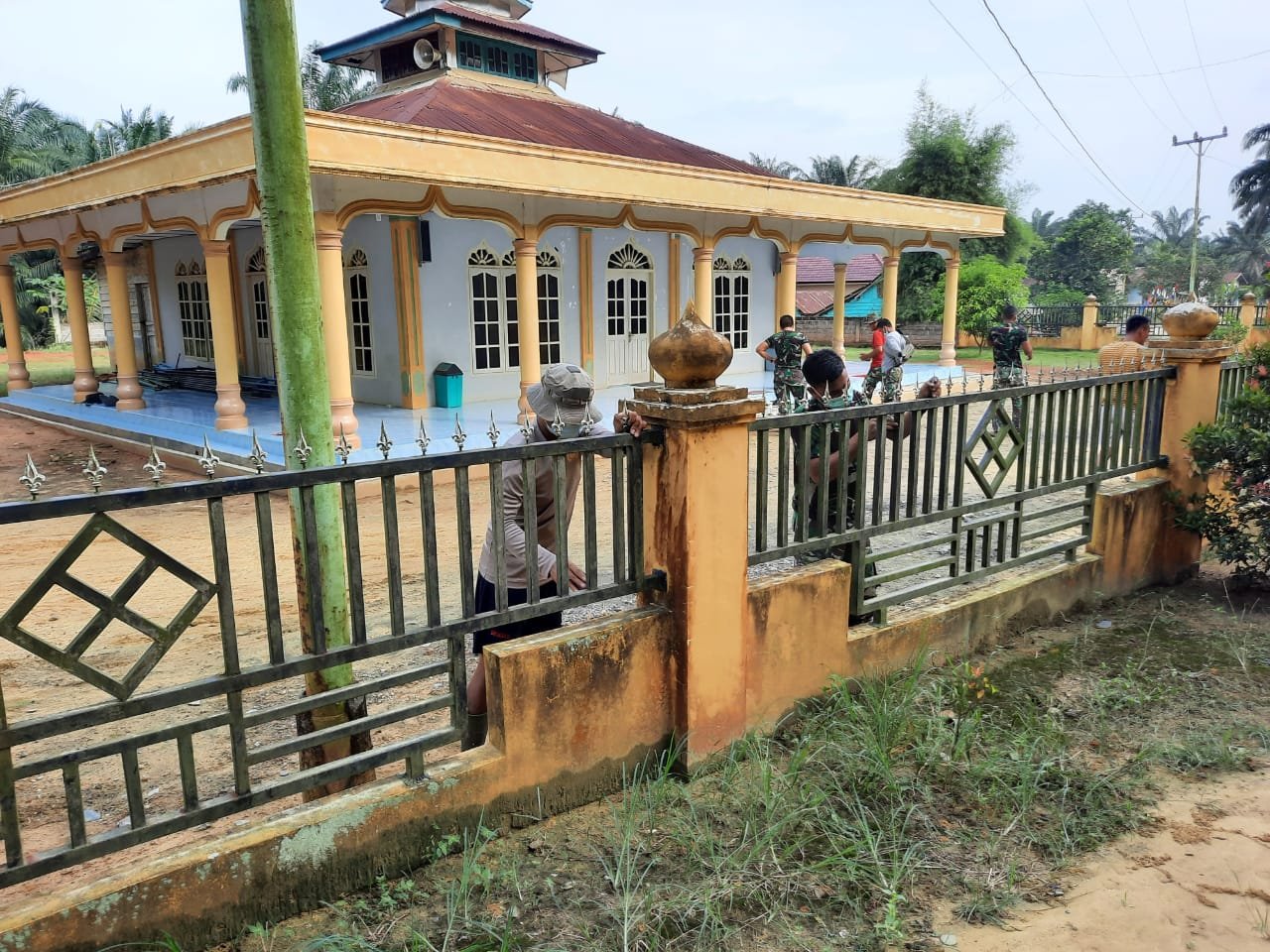 Mereka bekerja membersihkan halaman masjid dan mengecat pagar masjid Nurul Iman Dusun Salean Kep. Bagan Sinembah Jaya.