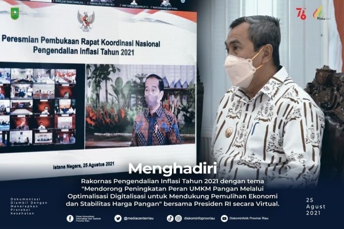 Pekanbaru(SegmenNews.com)- Gubernur Riau (Gubri) Syamsuar menghadiri Rapat Koordinasi Nasional (Rakornas) Pengendalian Inflasi Tahun 2021 secara virtual di Gedung Daerah Balai Serindit, Rabu (25/8/2021).