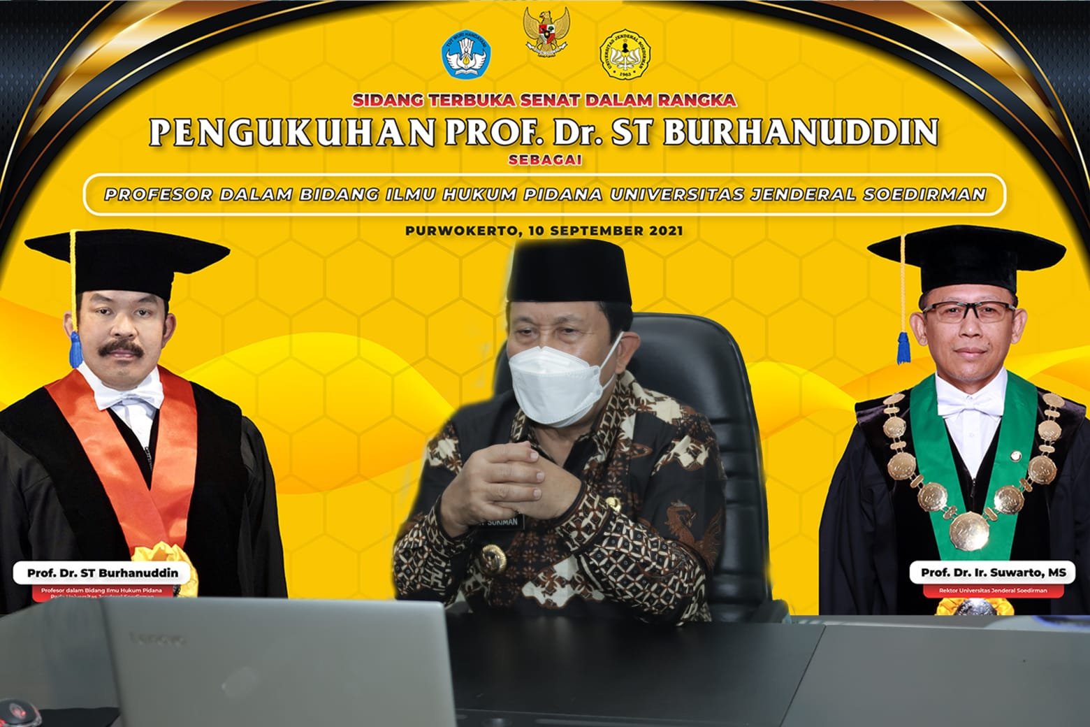 Acara tersebut diselenggarakam baik secara virtual maupun fisik. ST Burhanuddin dikukuhkan sebagai Profesor Dalam Bidang Ilmu Hukum Pidana Universitas Jenderal Soedirman. Tak terkecuali Bupati Rohul H. Sukiman ikut menyaksikan sahabatnya tersebut dikukuhkan sebagai Profesor secara Virtual.