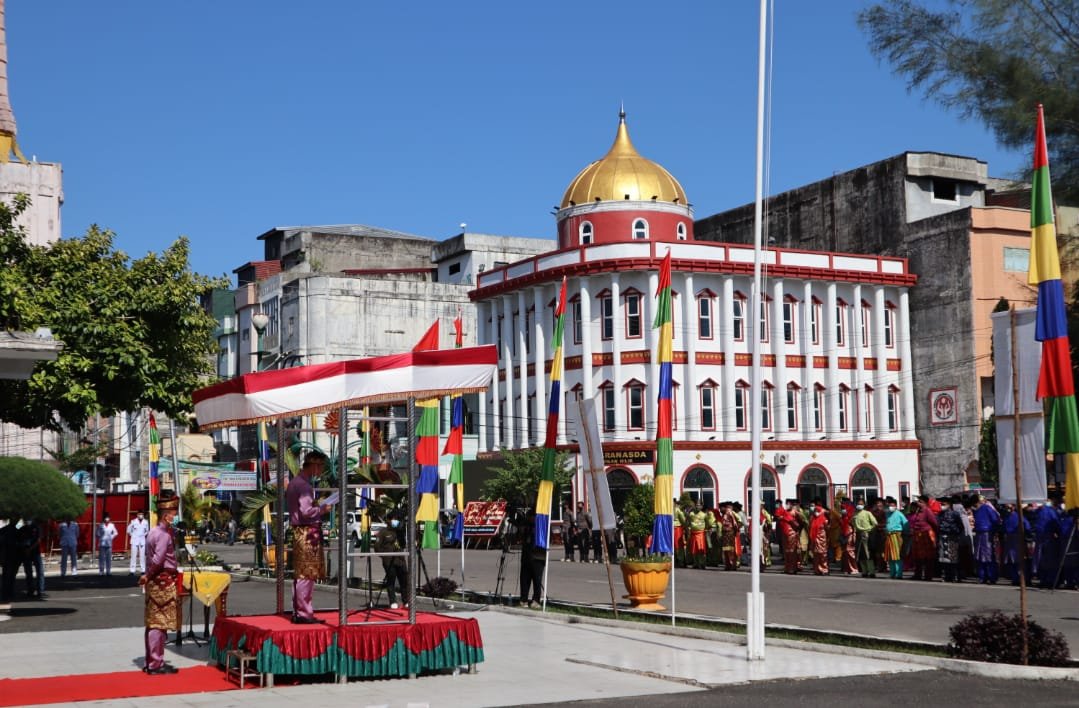 Bupati Rohil Afrizal Sintong secara langsung memimpin upacara peringatan HUT Rohil yang di pusatkan di depan kantor BPKAD, Jalan Merdeka, Bagansiapiapi, Senin (4/10/2021).