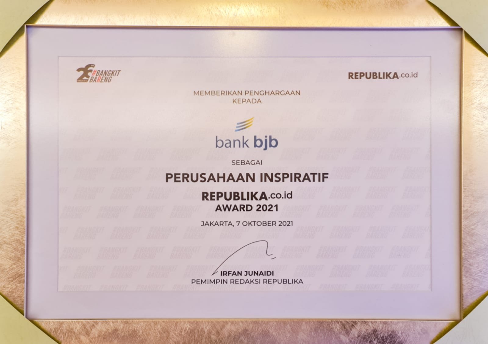 Jakarta(SegmenNews.com)- PT. Bank Pembangunan Daerah Jawa Barat dan Banten, Tbk. (bank bjb) kembali menorehkan prestasi atas kinerja yang telah dicapainya. bank bjb meraih penghargaan “Perusahaan Inspiratif” dari Republika.co.id Award 2021 yang diserahkan oleh Menteri Koperasi dan Usaha Kecil Menengah Republik Indonesia Teten Masduki dan diterima oleh Direktur Utama bank bjb Yuddy Renaldi serta turut hadir Menteri Koordinator Bidang Pembangunan Manusia dan Kebudayaan Republik Indonesia Muhadjir Effendy, Menteri Badan Usaha Milik Negara Republik Indonesia Erick Thohir dan Menteri Perdagangan Republik Indonesia Muhammad Lutfi, Kamis 7 Oktober 2021.