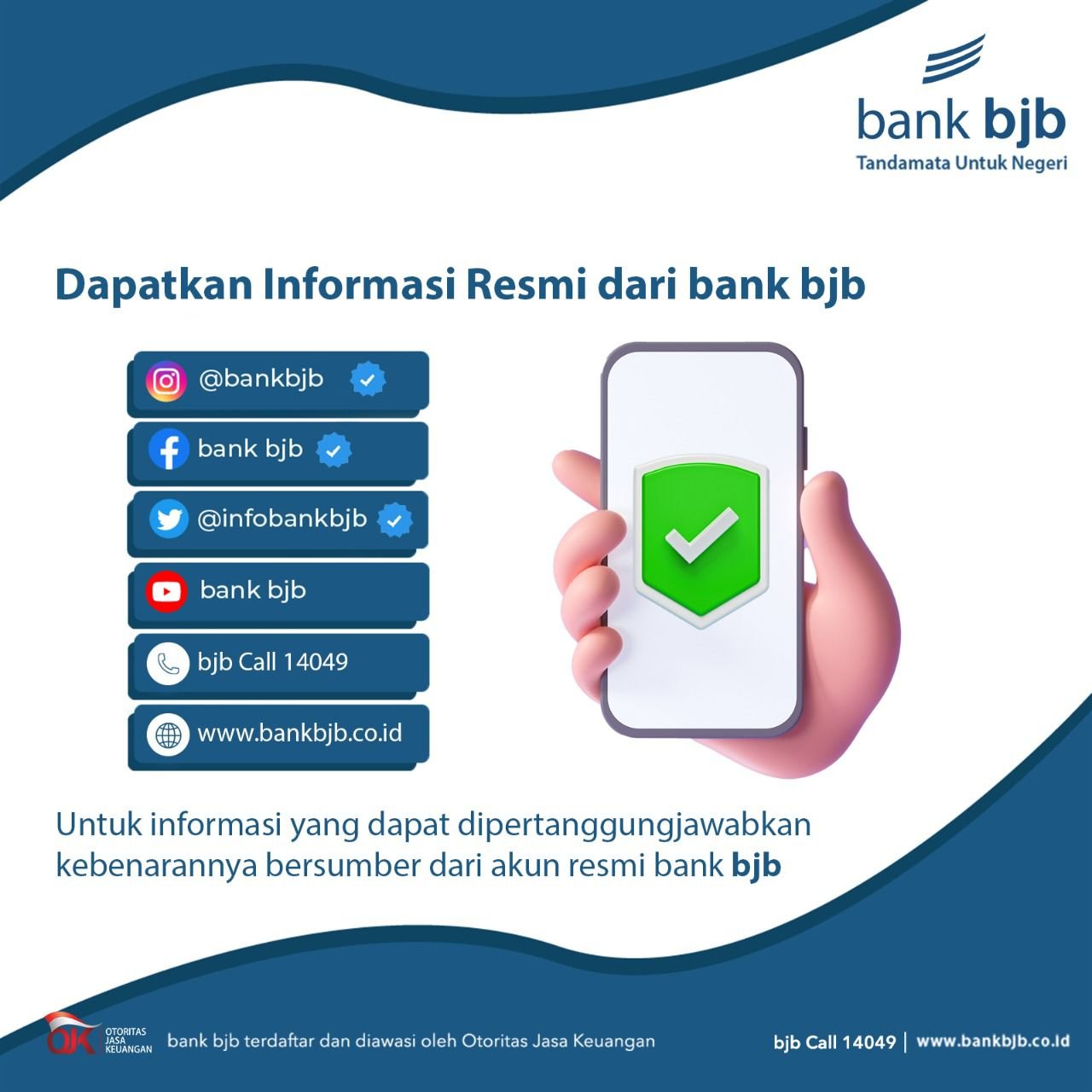 · Akun media sosial resmi bank bjb yakni Instagram @bankbjb, Twitter @infobankbjb, dan Facebook bank bjb (akun media sosial bank bjb Official adalah akun verified yang bercentang biru)