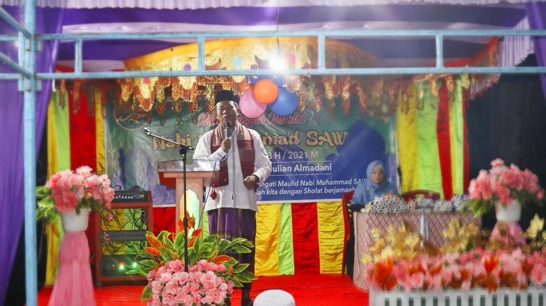 Maulid Nabi yang bertemakan ” Dengan memperingati maulid nabi Muhammad SAW mari kita tingkatkan ibadah kita dengan sholat berjamaah di mushola ” tersebut menghadirkan penceramah ustadz Drs Julian Almadani.
