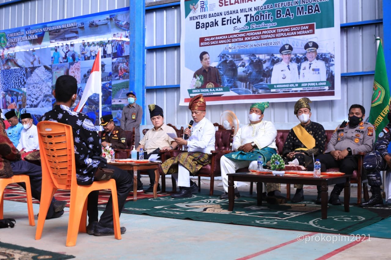 kegiatan di lanjutkan ke sentral IKM sagu terpadu Desa sungai Tohor Tebing Tinggi Timur, di sentral IKM sagu Menteri BUMN Erick Thohir dan Bupati kepulauan Meranti H. Muhammad Adil SH. berdialog bersama dengan penggiat usaha lokal, seperti penggiat Kopi, sagu, dan nelayan .