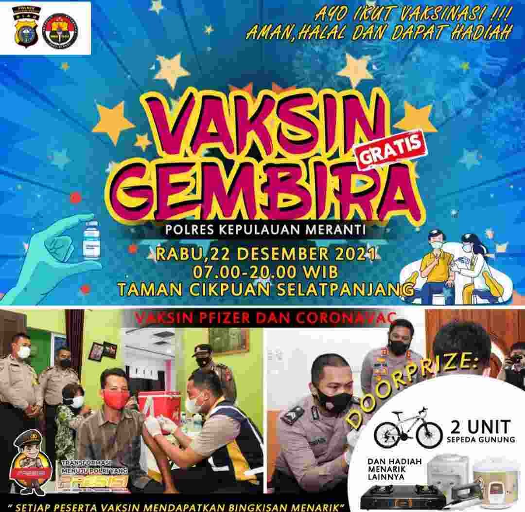 Meranti(SegmenNews.com)- Polres Kepulauan Meranti, Riau, pada Rabu (22/12/2021) akan melaksanakan vaksinasi gembira berhadiah di Taman Cikpuan, Selatpanjang, Kecamatan Tebingtinggi.