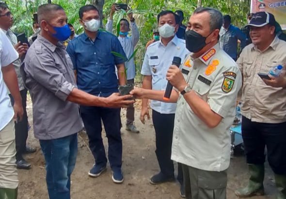Kuansing(SegmenNews.com)- Kelompok tani Hutan Air Buluh Kecamtan Kwantan Mudik Kwantan Singingi memberikan hadiah kepada Gubernur Riau (Gubri) bibit jernang.