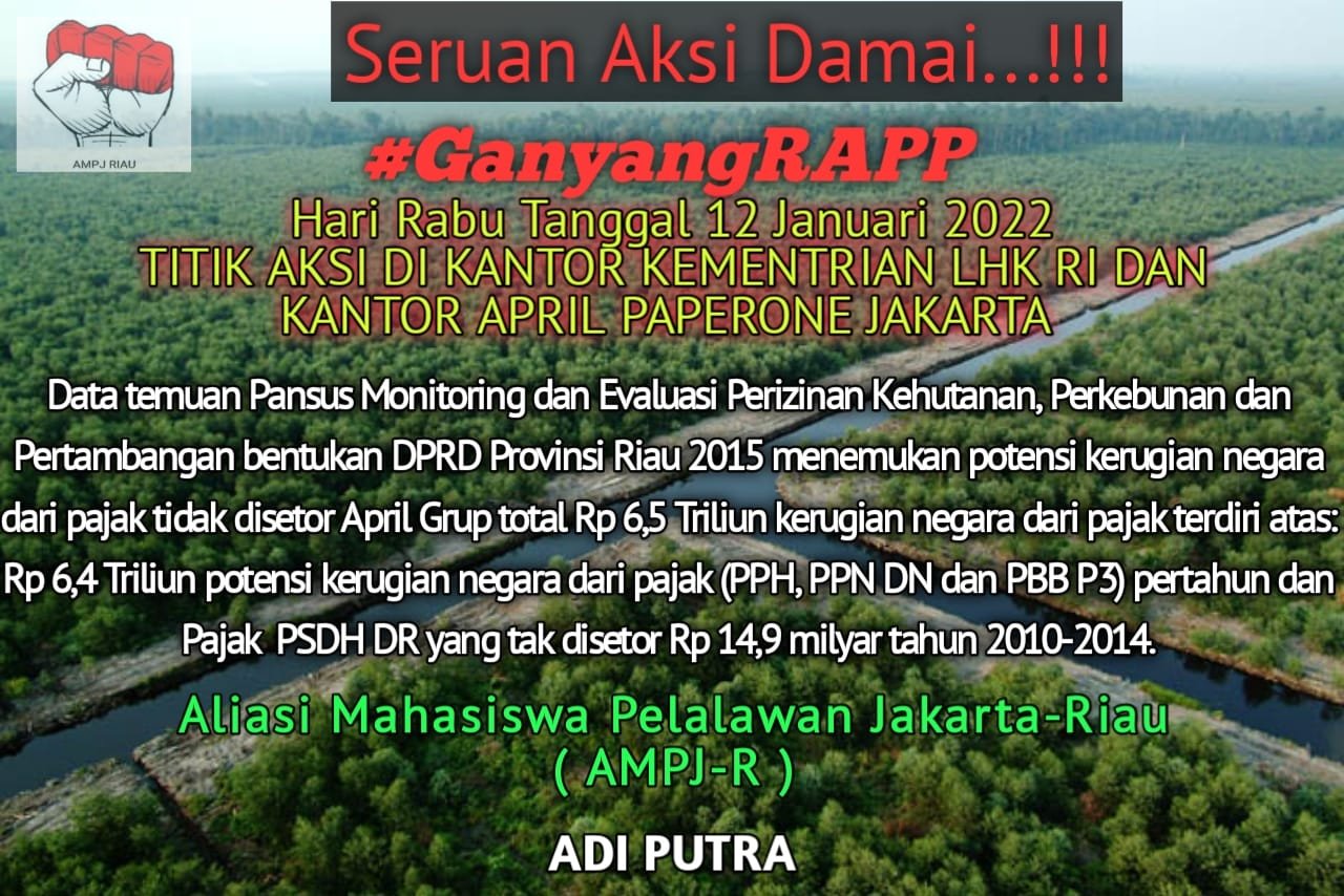 Sebagaimana diketahui AMPJ-R akan menggelar aksi damai di kantor Kemen LHK dan APRIL Paperone Jakarta, terkait data temuan Pansus monitoring dan evaluasi perizinan kehutanan, perkebunan dan pertambangan bentukan DPRD Provinsi Riau 2015.