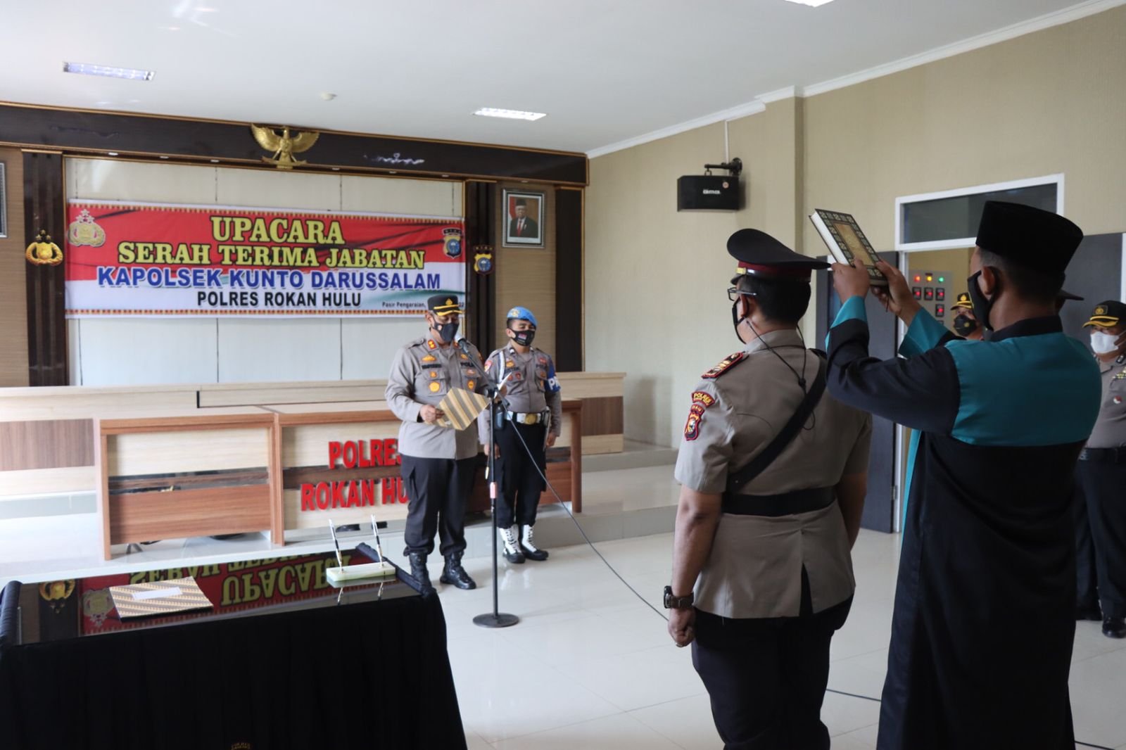 Rohul(SegmenNews.com)-Polres Rokan Hulu (Rohul) melakukan Serah Terima Jabatan (Sertijab) Kepala Kepolisian Sektor (Kapolsek) Kunto Darussalam dengan menerapkan Protokol Kesehatan (Prokes), Senin (14/2/2022).