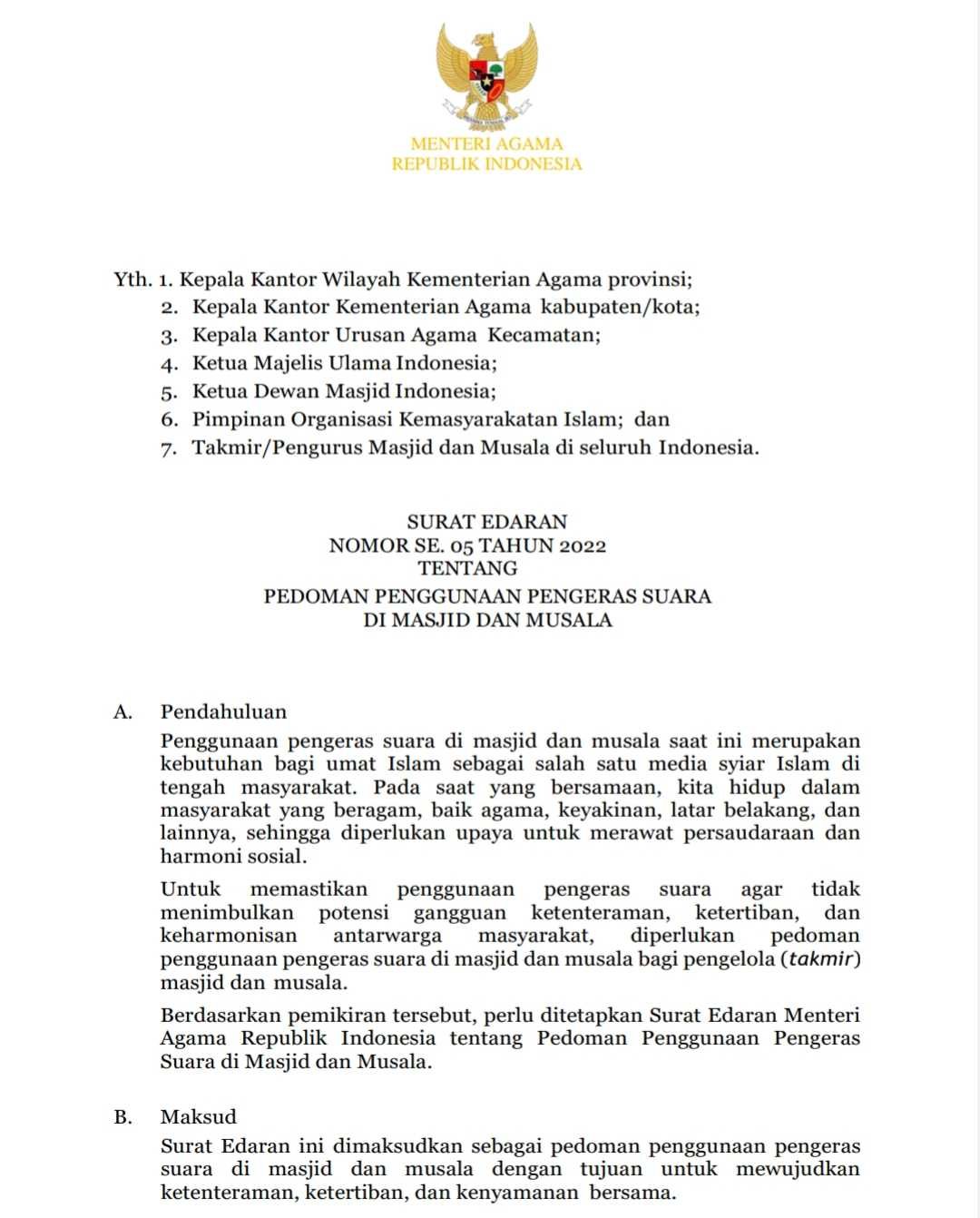 SegmenNews.com- Menteri Agama (Menag) Yaqut Cholil Qoumas menerbitkan surat edaran (SE) Nomor 05 tahun 2022 yang mengatur tentang penggunaan pengeras suara di masjid dan mushola.