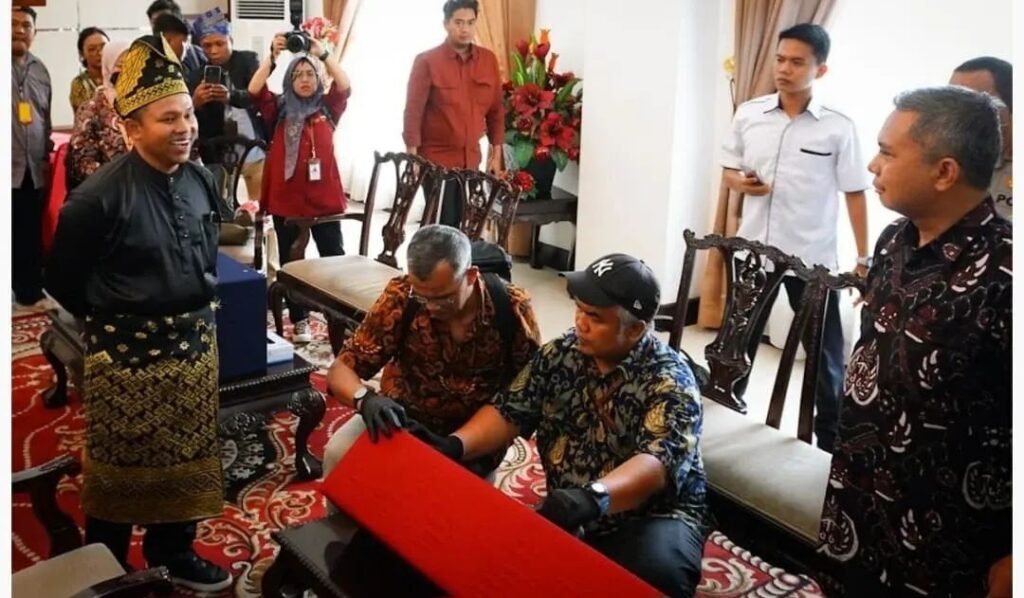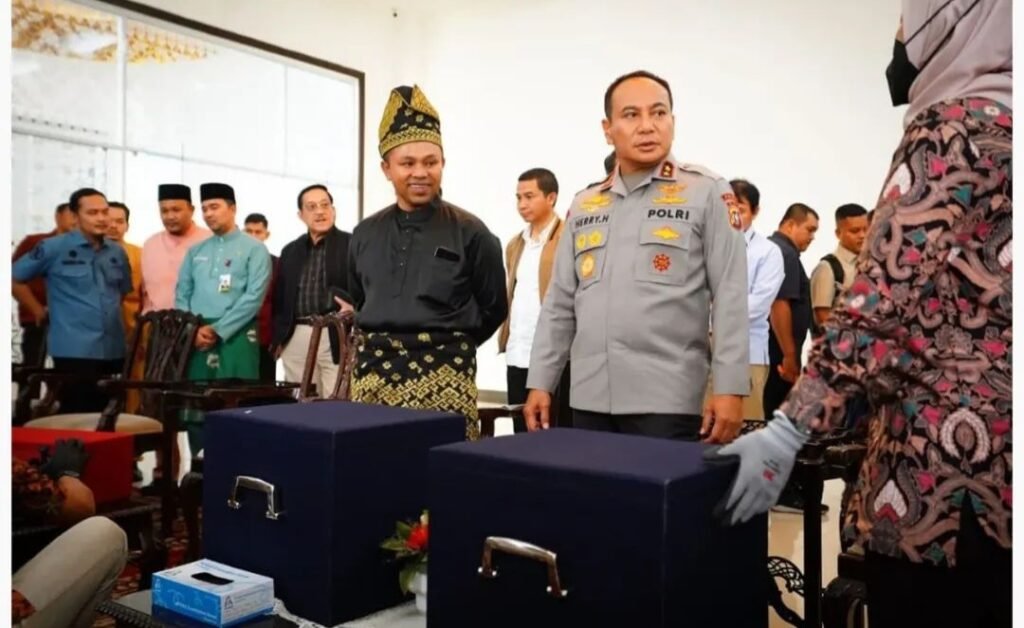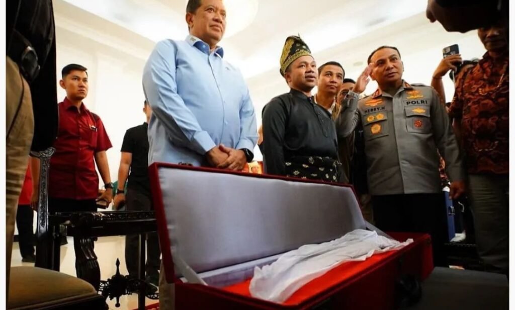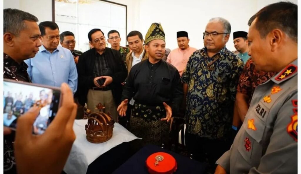 Pekanbaru(SegmenNews.com)- Gubernur Riau, Abdul Wahid bersama para tokih Adat Melayu Riau dan Kapolda menyanbut kedatangan Mahkota asli Kesultanan Siak Sri Indrapura.
