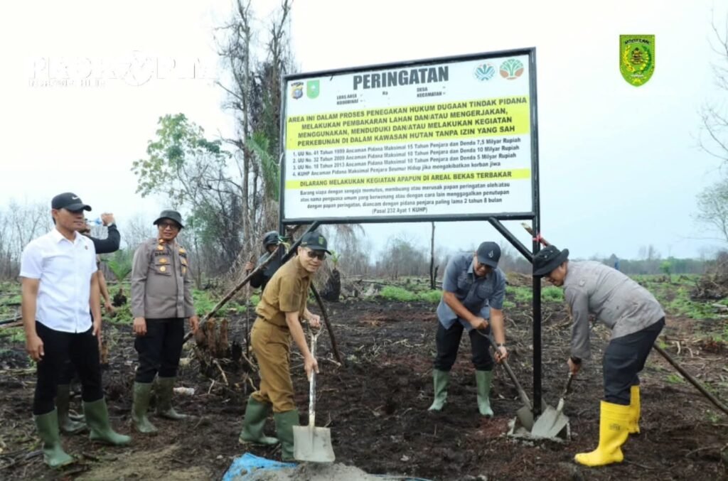 Inhil(SegmenNews.com)- Bupati Indragiri Hilir diwakili Asisten Pemerintahan dan Kesejahteraan bersama Ketua DPRD, Kapolres, Dandim 0314 Inhil serta Kejari Inhil menghadiri pemasangan plang / papan peringatan di lokasi terjadinya kebakaran hutan dan lahan di Desa Bayas Jaya Kec. Kempas, Senin (06/10/2025).