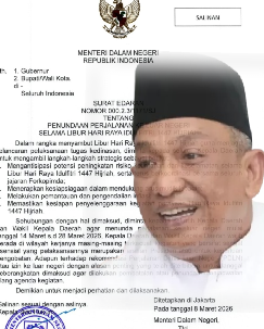 Kebijakan tersebut tertuang dalam Surat Edaran Mendagri Nomor 000.2.3/1171/SJ Tentang Penundaan Perjalanan ke Luar Negeri Selama Libur Hari Raya Idul Fitri 1447 Hijriah.