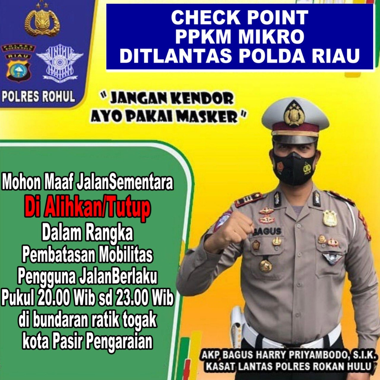 Penjelasan itu disampaikan oleh Kasat Lantas Polres Rokan Hulu AKP Bagus Harry Priambodo kepada media, disela pelaksanaan kegiatan PPKM Mikro di ruas Jalan Lingkar Ratik Togak-Desa Pematang Berangan Kecamatan Rambah Kabupaten Rokan Hulu.