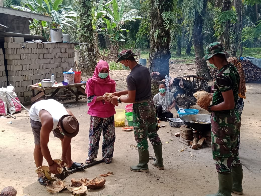 Rohil(SegmenNews.com)-Disela istirahat kegiatan TNI manunggal membangun desa (TMMD) ke-111 Komando distrik militer (Kodim) 0321/Rohil, anggota satgas TMMD anjangsana kesalah satu warga, Senin (05/07/2021). Anggota satgas TMMD ini membantu warga mengupas kelapa.