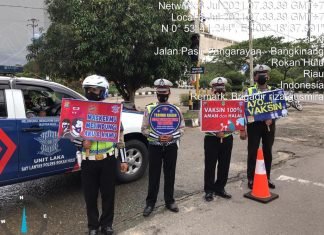 Satlantas Polres Rohul Gencarkan Sosialisasi Vaksin dan Antisipasi Covid-19 Keliling Pasir Pengaraian