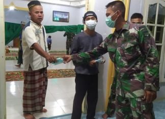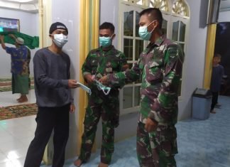 Anggota Satgas TMMD Kodim 0321 Rohil Peduli Prokes, Bagikan Masker Kepada Jemaah Mesjid