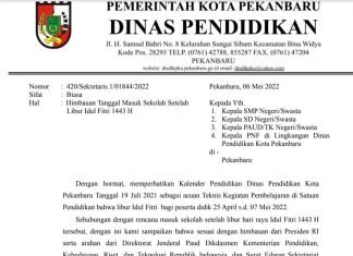 Pekanbaru(SegmenNews.com)- Dinas Pendidikan Kota Pekanbaru mengeluarkan surat imbauan terkait aturan proses belajar mengajar untuk sekolah tingkat PAUD, TK, SD dan SMP pasca libur panjang lebaran Idul Fitri 2022 di Kota Pekanbaru.Surat imbauan tersebut dikeluarkan...