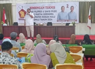 Rohul(SegmenNews.com)- DPC Partai Gerindra Kabupaten Rokan Hulu (Rohul) menggelar Bimbingan Teknis (Bimtek) terhadap saksi Pemilihan Presiden (Pilpres) dan Pemilihan legislatif (Pileg) tahun 2024, di Hotel Gelora Bhakti Jumat (09/02/2024).Bimtek tersebut dihadiri Ketua DPC Gerindra...
