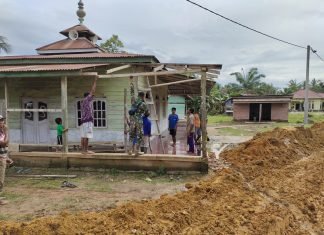 Rohil(SegmenNews.com)- Camat Bagan Sinembah Raya M.Yusuf didampingi Pasi Pers Kodim 0321/Rohil Kapten Kairul secara langsung meninjau pembangunan mushola dan tempat whudu program TMMD ke 111, Kamis (8/7/2021).