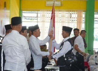 Pekanbaru(SegmenNews.com)- Gubernur Riau Haji Syamsuar memegang bendera merah putih (kiri) di acara pelepasan calon jemaah haji di asrama Embarkasi Haji Antara (EHA) Riau, Rabu (24/5/2023).Pekanbaru(SegmenNews.com)- Gubernur Riau (Gubri), Syamsuar melepas 374 Calon Jemaah Haji...